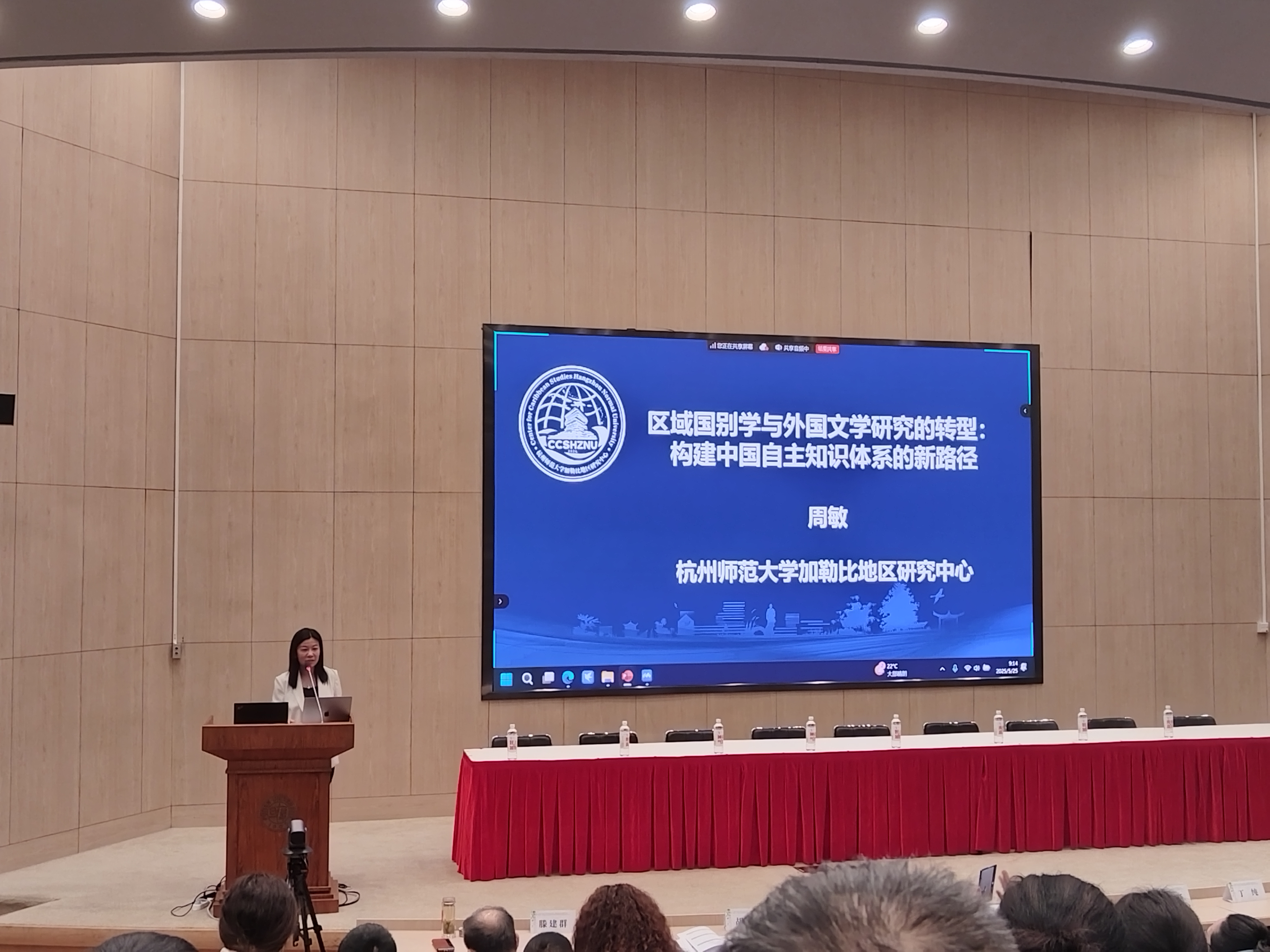 在本次会议上,周敏院长发表了题为“区域国别学视阈下的外国文学自主知识体系构建”的主旨发言。她认为在外语学科面临巨大挑战的今天,学科转型势在必行,而区域国别研究将成为外语学科发展的“新赛道”。她强调,区域国别研究应立足于语言、区域与专业融合,服务知识体系建设与国际视野人才培养的双重目标。随后,周院长以永乐视频 加勒比地区研究中心为例,介绍了该中心的建设情况,并分享了永乐视频 加勒比研究团队的实践探索心得。周院长的发言引发了现场众多学者的共鸣,得到与会专家们的一致认可。