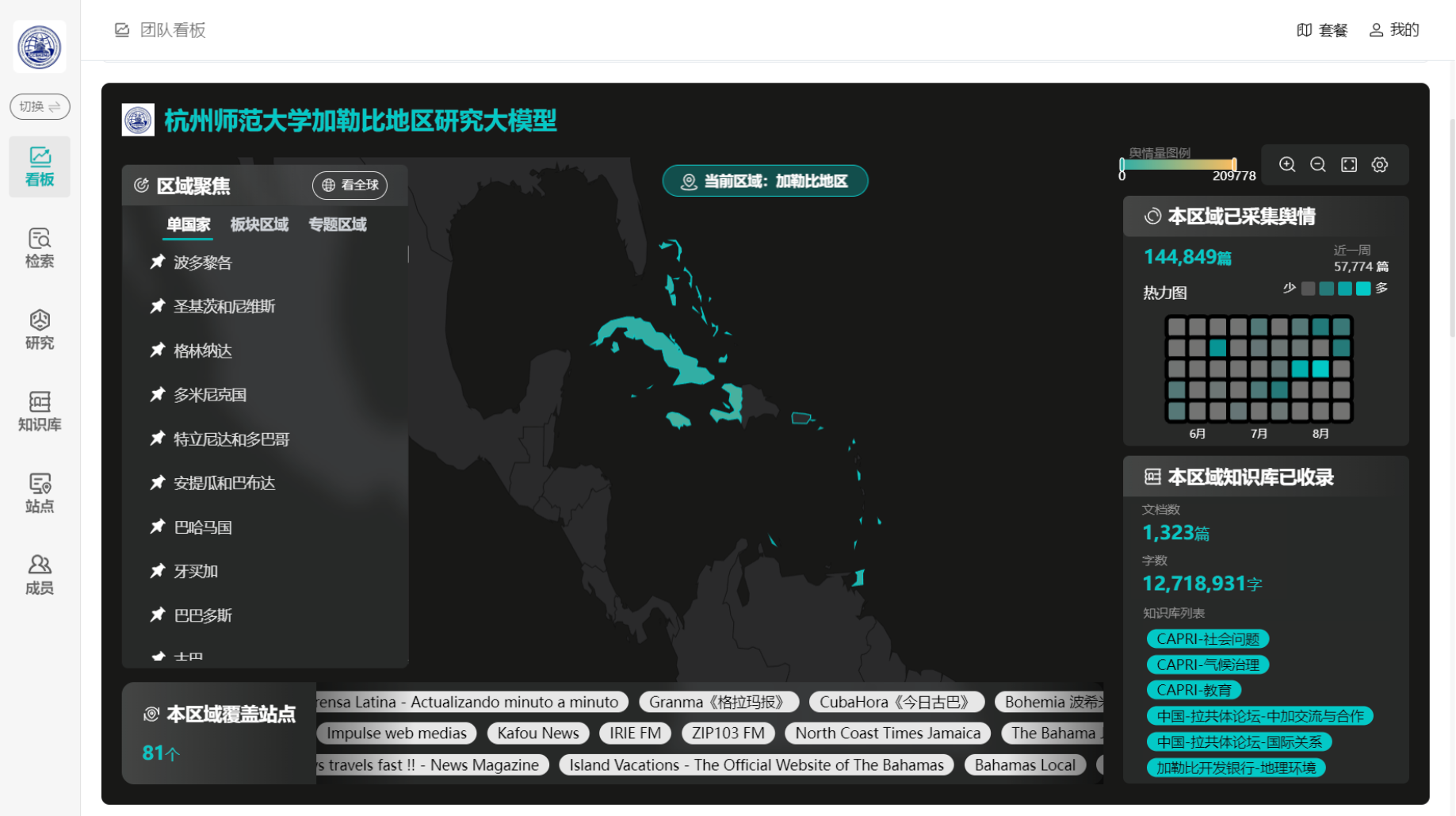 永乐视频 依托多年在加勒比研究领域的积累,聚焦文化、经贸、医疗、环境四大方向,形成了“大模型+平台”一体化解决方案。该平台集数据采集、智能分析、知识库构建、成果转化等功能于一体,可实现多语种资料的快速处理和跨领域信息的高效整合,为科研人员提供有力支持。目前,该大模型涵盖加共体国家及世界主要媒体400余家,已采集近五年的14.5万篇舆情信息及1300余篇研究报告、政府文件,总字数1271万。