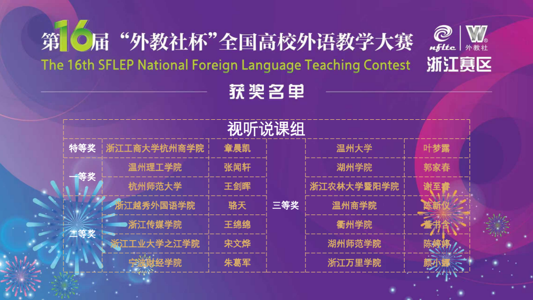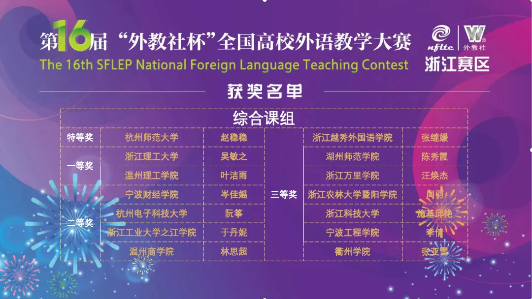 经过激烈角逐,两个组别分别评选出特等奖一名、一等奖两名、二等奖四名、三等奖七名。其中,来自永乐视频 的赵稳稳老师荣获综合课组的特等奖,浙江工商大学杭州商学院的章晨凯老师摘得视听说组特等奖的桂冠。他们将代表浙江赛区晋级2025年12月在上海举办的全国决赛与总决赛,有望在全国舞台上展现浙江高校外语教学的丰硕成果。