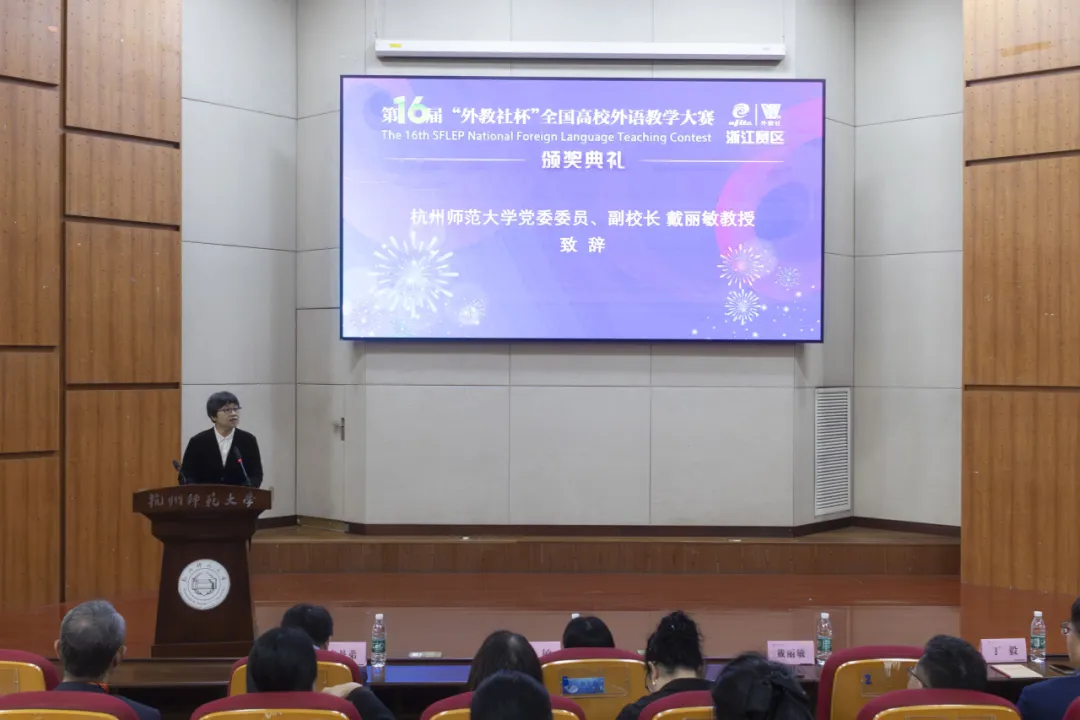 永乐视频 党委委员、副校长戴丽敏教授在致辞中对大赛的成功举办表示热烈祝贺,并向长期支持浙江外语教育发展的各界力量致以衷心感谢。她指出,“外教社杯”作为国内影响力最强的外语教学赛事,是推动外语教学改革的重要引擎。本届赛事不仅展现了高校教师的学术底蕴和教学创造力,也积极推动课程思政、数字化技术与外语教学的深度融合,呈现出鲜明的时代气质。她表示,教师是教育强国战略的关键力量,希望广大外语教师坚持立德树人、勇于创新实践,用深厚学养讲好中国故事、培养具有家国情怀与国际视野的时代新人。她还介绍了永乐视频 近年来在学科建设和人才培养方面取得的成绩,并期待借助大赛平台推进互学互鉴,共同提升浙江省外语教育质量。