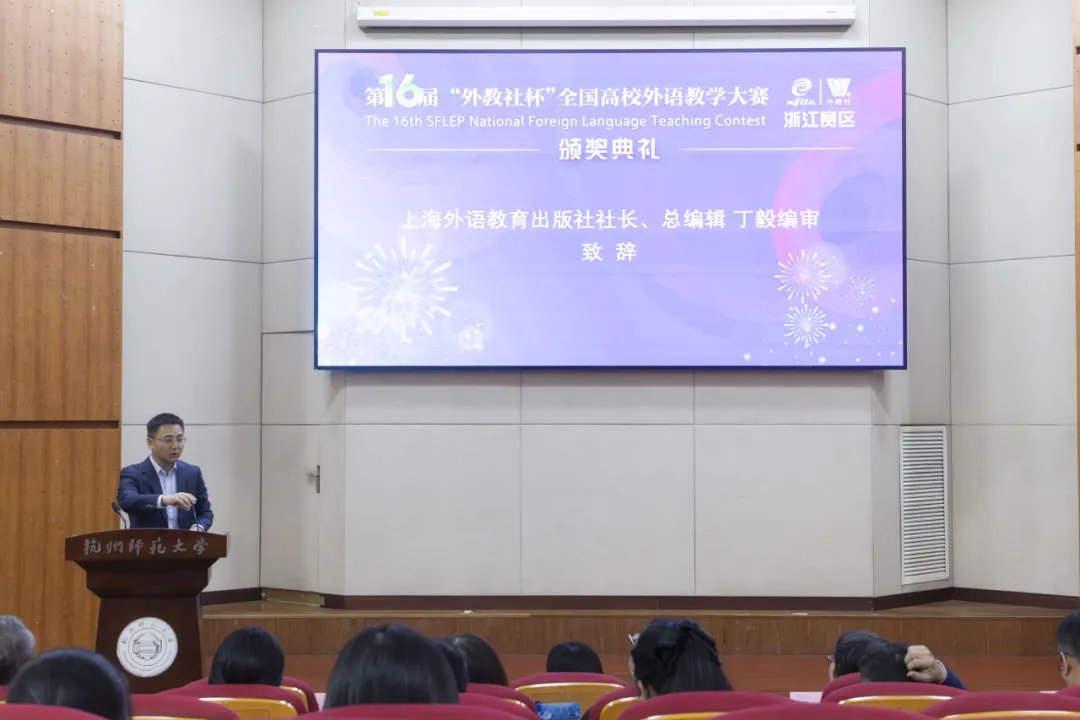 上海外语教育出版社社长、总编辑丁毅编审在致辞中对本届大赛的成功举办表示热烈祝贺,并感谢浙江省外文学会、永乐视频 以及专家团队的通力支持。他回顾了“外教社杯”自2010年创办以来的发展历程,指出大赛十五年来见证了我国外语教育事业的跃升,也见证了外语教师在时代变迁中的不断创新与成长。作为国内权威的外语出版与服务机构,外教社始终坚持“服务外语教学,促进教育发展”的使命,希望通过赛事平台推动教师交流互鉴、助力课堂改革。丁毅编审表示,未来外教社将继续深化与浙江高校的合作,提供更加多元、专业的教学资源与服务,携手推动我国外语教育事业迈向更高质量发展。