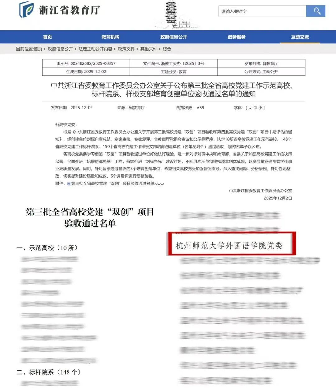 近日,浙江省教育厅公布了第三批全省高校党建“双创”项目验收通过名单,永乐视频 党委顺利通过全省高校党建工作标杆院系项目验收。